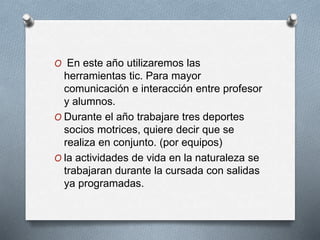 Este documento presenta el plan de estudios de educación física para el año escolar. Se utilizarán herramientas TIC como un blog para mejorar la comunicación entre profesores y estudiantes. Se trabajarán tres deportes de equipo - básquetbol, voleibol y handbol - de manera progresiva cada trimestre. También habrá actividades al aire libre como campamentos. El objetivo es desarrollar valores, habilidades, participación y respeto a través del deporte y la vida al aire libre.