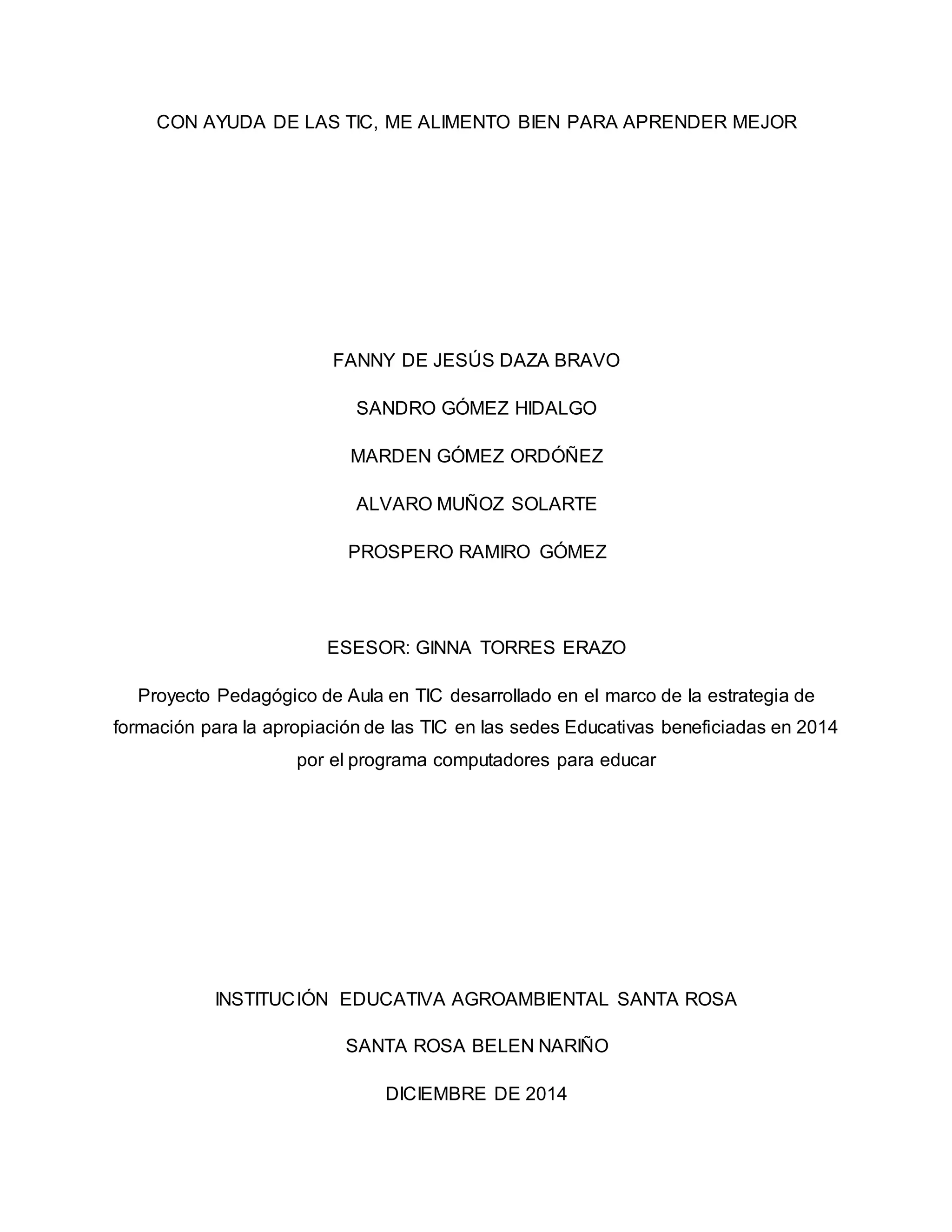 El documento aborda un proyecto pedagógico que busca sensibilizar a estudiantes de quinto grado sobre buenos hábitos alimenticios utilizando TIC, debido a su impacto en la salud y rendimiento académico. Se identifican diversas dificultades y oportunidades, así como la necesidad de mejorar la educación nutricional en un contexto de cambios culturales y familiares. La propuesta incluye el uso de tecnologías educativas para potenciar el aprendizaje y fomentar el desarrollo de huertas escolares como parte de un enfoque agroecológico.
