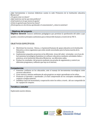 El proyecto pedagógico 'Exploro nuestro idioma' busca mejorar la comprensión del español en estudiantes de 3º a 5º grado mediante el uso de tecnologías de información y comunicación (TIC) en la Institución Educativa Monterrey. A través de actividades lúdicas y el uso de recursos tecnológicos, se pretende motivar a los estudiantes, involucrar a los padres y evaluar el progreso en el aprendizaje del idioma. El enfoque cualitativo de la investigación permitirá identificar las falencias en los estudiantes y aplicar estrategias que faciliten su aprendizaje.