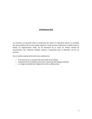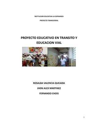 Este documento presenta un proyecto de educación vial para estudiantes de la Institución Educativa La Esperanza. El proyecto busca capacitar a los estudiantes sobre seguridad vial para prevenir accidentes a través de métodos didácticos y lúdicos. Incluye objetivos generales como enseñar hábitos de respeto a las normas de tránsito y estimular la responsabilidad como peatones o pasajeros.