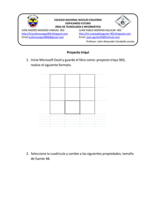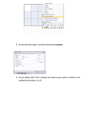 El documento proporciona instrucciones para crear un tablero de juego de triqui en Microsoft Excel. Incluye pasos como formato de celdas, tamaño de fuente, alineación de texto, validación de datos para las entradas X u O, y duplicación de estas validaciones en todas las celdas del tablero. El propósito es analizar las posibilidades de ganar para cada jugador y definir las reglas para determinar un ganador.