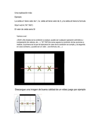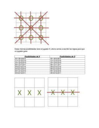 El documento describe los 7 pasos para crear un juego de triqui en Excel. Primero, se guarda el archivo para evitar su eliminación. Luego, se inicia Excel y se crea una tabla de 3x3 celdas con formato adecuado. Después, se personaliza el tamaño y formato de las celdas. Finalmente, el documento explica que hay 8 posibilidades en el juego de triqui.
