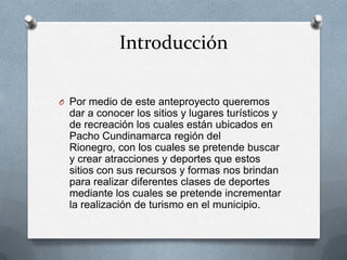 El documento describe varios sitios y lugares turísticos en Pacho, Cundinamarca, Colombia, incluyendo el Chorro de Virginia, la Laguna de Bermejal, la Torre de los Indios, la Riviera del Rionegro y el Horno de la Ferrería. El objetivo es promover el turismo en la región mediante la implementación de deportes y actividades recreativas en estos lugares, como rapel, parapente, moto acuática, esquí acuático, canopy y kayak.