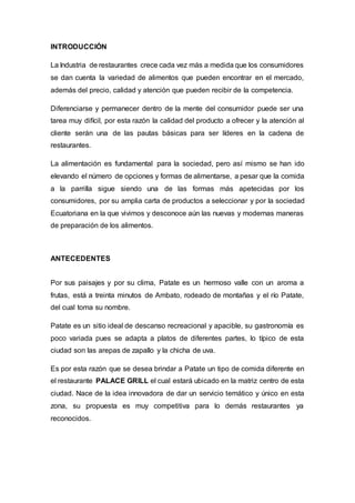 El documento presenta un plan de negocios para la creación de un restaurante de carnes a la parrilla llamado "Palace Grill" en la ciudad de Patate, Ecuador. El restaurante ofrecerá una variedad de platos a la parrilla para satisfacer la necesidad de opciones de comida en la ciudad. El plan incluye una misión, visión, objetivos, estructura organizacional, análisis FODA y plan de acción para gestionar el restaurante de manera rentable y sostenible.