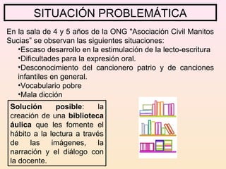 El proyecto 'Un libro en mi salita' busca implementar una biblioteca áulica en la ONG 'Asociación Civil Manitos Sucias' para estimular la lecto-escritura y la expresión oral en niños de 4 y 5 años provenientes de hogares con escasos recursos. Se propone un enfoque pedagógico que fomente el aprendizaje autónomo y la creatividad, utilizando libros adecuados para potenciar el interés por la lectura y mejorar la comunicación. La biblioteca se inaugurará en 2011 como una experiencia piloto, con el apoyo de especialistas y autores locales, para integrar la mediación de adultos y promover un ambiente de aprendizaje significativo.