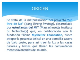 Este documento describe un proyecto llamado "Un litro de luz" desarrollado por estudiantes del MIT y una fundación filipina para crear bombillas solares caseras de bajo costo utilizando botellas de plástico, agua, lejía y silicona. El objetivo es proporcionar iluminación a hogares en comunidades desfavorecidas que carecen de electricidad de manera segura, económica y sostenible aprovechando la energía solar.