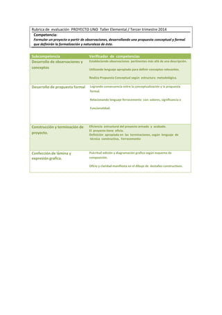 Este documento presenta una rubrica de evaluación para un proyecto de ferrocemento que evalúa las competencias de formular un proyecto a partir de observaciones, desarrollar una propuesta conceptual y formal, y construir y terminar el proyecto de manera estructuralmente eficiente y con definición apropiada en las terminaciones.