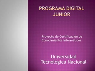 El documento describe un programa de certificación de conocimientos informáticos implementado por la Universidad Tecnológica Nacional y un colegio. El programa ofrece contenidos de estudio, certificación de conocimientos, capacitación docente, material educativo digital e innovación tecnológica. La certificación brinda un valor agregado a los estudiantes al acreditar conocimientos requeridos por el mercado laboral.