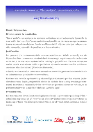 La campaña 'Abre sus ojos' de la Fundación Manantial busca prevenir problemas visuales entre personas con trastorno mental mediante revisiones gratuitas y atención personalizada. Durante el evento, que se llevará a cabo del 3 al 7 de octubre de 2013 en Madrid, se realizarán exámenes de visión y salud auditiva a 300 beneficiarios, apoyados por 50 profesionales de la salud. Esta iniciativa responde a la necesidad de atención especializada para mejorar la calidad de vida y la integración social de un colectivo vulnerable.
