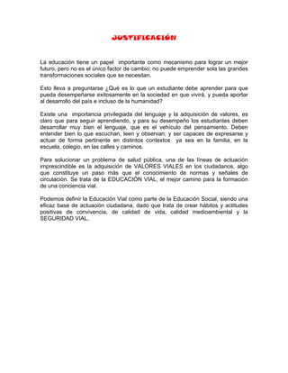 Este documento presenta un proyecto de educación vial dirigido a estudiantes. Su objetivo general es ofrecer herramientas pedagógicas que permitan orientar a los estudiantes hacia una cultura de comportamiento vial saludable y seguro. El proyecto busca promover el conocimiento de señales de tránsito, desarrollar actividades lúdicas sobre su uso, y fomentar la autonomía y seguridad personal de los estudiantes en entornos de tráfico.