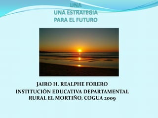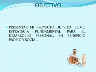 Este documento presenta el proyecto de vida de Jairo H. Realphe Forero. Describe la importancia de tener un proyecto de vida para lograr metas personales y beneficiar a la sociedad. Resume su biografía, incluyendo su familia, educación e intereses. Identifica sus fortalezas y debilidades. Explica sus sueños de viajar, crear una fundación y continuar sirviendo a los demás a través de la educación e investigación. Su propósito es terminar obras en curso y continuar contribuyendo al desarrollo social de su país.