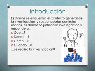 Este documento presenta las secciones clave para un proyecto de investigación y brinda una breve descripción de cada una. Incluye secciones como la introducción, justificación, objetivos, marco teórico, método, análisis de resultados, conclusiones, recomendaciones, bibliografía y anexos. El propósito general es guiar al lector sobre los componentes esenciales para el diseño y desarrollo de un proyecto de investigación.