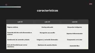 La Web 1.0 consistía en páginas estáticas con contenido almacenado en archivos y navegación sencilla. La Web 2.0 introdujo contenido generado por los usuarios, opiniones y redes sociales. La Web 3.0 proporcionará búsquedas inteligentes, computación en la nube, realidad aumentada y una experiencia más personalizada para los usuarios.