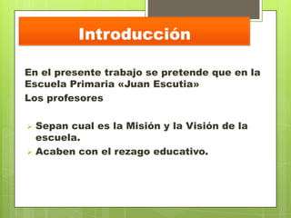 El documento propone que los maestros de la Escuela Primaria "Juan Escutia" definan la misión y visión de la escuela, busquen estrategias para mejorar el rendimiento de los estudiantes con rezago educativo, y elaboren un plan de acción. Los maestros trabajarán en grupos por grado y utilizarán recursos en línea para mejorar sus clases de acuerdo con la teoría constructivista. El objetivo es mejorar los resultados académicos de los estudiantes al final del ciclo escolar.