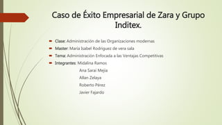 Este documento resume el caso de éxito empresarial de Zara y el Grupo Inditex. Zara fue fundada en 1963 y se ha convertido en la primera marca española más valiosa del mundo. Su éxito se debe a su enfoque en la innovación, calidad, servicio, rapidez y competitividad de costos. Zara puede producir nuevas colecciones periódicamente que reflejan las últimas tendencias de moda a precios accesibles, lo que sus competidores no pueden copiar fácilmente.