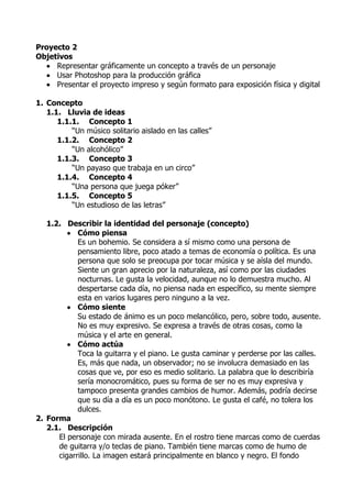 Este documento presenta un proyecto de fotomontaje de un personaje para un curso de introducción a los medios digitales. Describe el concepto del personaje como un músico bohemio solitario y melancólico. Explica que se usará Photoshop para crear una imagen en blanco y negro que muestre al personaje con marcas de guitarra y piano en su rostro, en un ambiente nocturno que evoque sentimientos de desgaste, pérdida, nostalgia y soledad.