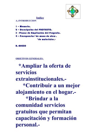 Este documento describe un proyecto para ampliar una institución que brinda alojamiento y servicios a jóvenes carenciadas en La Rioja, Argentina. El proyecto tiene como objetivos ampliar la oferta de servicios extrainstitucionales como computación e inglés, contribuir a un mejor alojamiento, y brindar capacitación y formación a la comunidad. La ampliación permitiría albergar a más beneficiarios incluyendo familiares y ofrecer nuevos servicios contextualizados a la realidad local de manera gratuita.