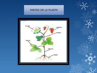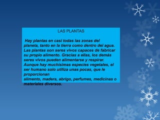 Las plantas se encuentran en casi todas partes del planeta y son seres vivos capaces de producir su propio alimento. Están compuestas de raíces que absorben agua y minerales del suelo, tallos que transportan los líquidos, hojas donde ocurre la fotosíntesis, flores para la reproducción, y frutos que contienen las semillas.