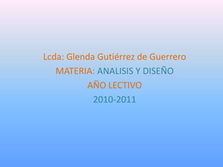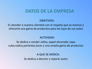 Este documento presenta los datos de una empresa que se dedica a decorar y reparar autos. Incluye objetivos, actividad, organización y una base de datos con tablas de vendedores, clientes, proveedores, productos y facturas. También incluye diagramas de jerarquía, primer y segundo nivel, y conclusiones sobre la importancia de representar cada empresa y su sistema de manera estructurada.