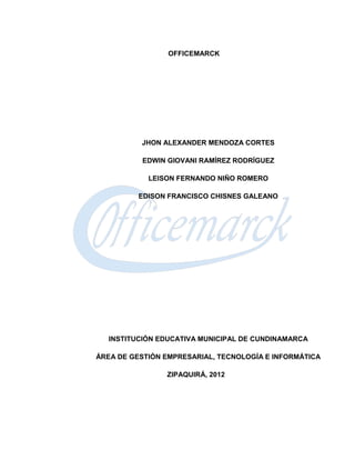 El documento describe el proceso de generación de ideas de negocio llevado a cabo por los socios de OFFICEMARCK. Inicialmente realizaron una encuesta para identificar las necesidades del mercado. Luego generaron 20 ideas que evaluaron según criterios personales, de mercado y recursos. La idea con mayor puntaje fue una comercializadora y distribuidora de insumos de papelería. Eligieron el nombre OFFICEMARCK y un slogan para representar su marca.