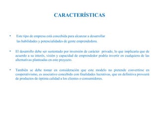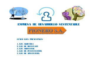 Este documento describe un modelo de empresa sostenible basado en cinco ejes: agricultura, reciclaje, artesanía, piscicultura y apicultura. Se enfoca en promover el desarrollo de emprendedores de manera sustentable y lucrativa mediante la asociatividad y métodos de producción respetuosos con el medio ambiente.