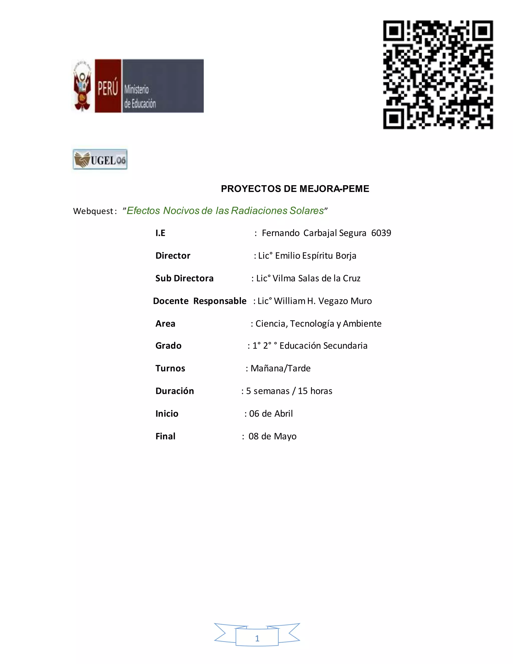 Este documento describe un proyecto de 5 semanas para estudiantes de 1° y 2° grado de educación secundaria sobre los efectos nocivos de las radiaciones solares. El proyecto utilizará una estrategia de aprendizaje basada en web llamada WebQuest para guiar a los estudiantes a investigar este tema en Internet de manera autónoma pero guiada. Los estudiantes trabajarán en equipos para crear presentaciones en plataformas como SlideShare y PowToon usando información sobre los efectos de las radiaciones y compartirán sus hallazgos. El