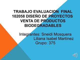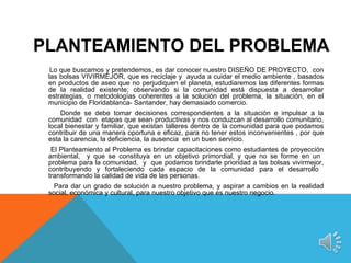 Este documento presenta el diseño de un proyecto para la venta de productos biodegradables. Describe el planteamiento y formulación del problema, que es dar a conocer el proyecto de bolsas biodegradables llamadas "Vivirmejor" para ayudar al medio ambiente. Justifica el proyecto para satisfacer las necesidades de la comunidad y sensibilizar a los consumidores. Los objetivos son presentar el proyecto para prevenir la contaminación y mejorar aspectos ambientales, y realizar estudios de conservación. El marco contextual describe los antecedentes de los