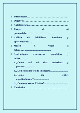 El documento es un proyecto de vida de Angie Dayana Prada Trujillo, donde narra su pasado, presente y aspiraciones futuras. Destaca sus fortalezas y debilidades, así como su misión de crecimiento intelectual y personal, y su deseo de estudiar ingeniería industrial. A través de este proyecto, Angie reflexiona sobre su vida y establece metas claras para su futuro, apoyándose en su familia y fe.