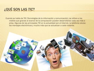 El documento habla sobre las Tecnologías de la Información y Comunicación (TIC) y su uso en la educación. Explica que las TIC como Internet, teléfonos celulares y correo electrónico se han incorporado ampliamente en la educación y pueden influir en la formación de la personalidad de las personas y en sus habilidades para interactuar con estos medios. También menciona algunos usos positivos y negativos potenciales de las TIC.