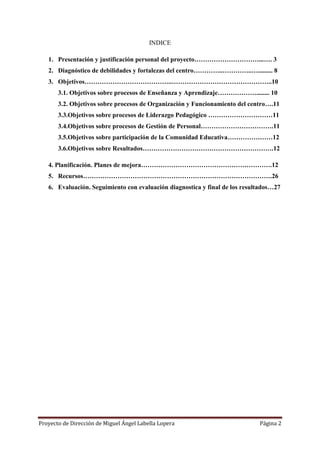 Este proyecto de dirección para el IES Carmen de Burgos tiene como objetivo liderar el centro en los próximos años. El autor detalla los requisitos legales para ser director y justifica por qué es la persona adecuada para el puesto, basándose en su experiencia como jefe de estudios adjunto. Además, presenta los principios y modelo de gestión que seguirá, como el trabajo cooperativo, la participación de la comunidad educativa y lograr la calidad a través de la equidad. Finalmente, realiza un análisis DAFO para diagnosticar las fort