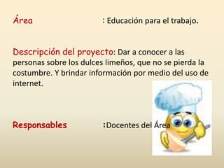 Este proyecto busca dar a conocer los dulces típicos de Lima a estudiantes de tercer grado de secundaria a través del uso de Internet y plataformas educativas. Los objetivos son permitir que los estudiantes aprendan sobre la elaboración, historia y costumbres de los principales dulces limeños. La evaluación será integral e incluirá la elaboración de productos, participación en foros y chats para intercambiar información sobre los dulces tradicionales peruanos.