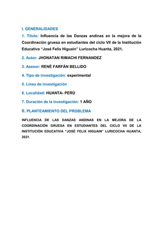 Este documento presenta un proyecto de investigación sobre la influencia de las danzas andinas en la mejora de la coordinación gruesa en estudiantes de primaria en Perú. El proyecto describe el problema de la falta de coordinación gruesa en los estudiantes y cómo las danzas andinas podrían ayudar a mejorarla. Los objetivos son evaluar los efectos de las danzas andinas en la coordinación motriz, cognitiva y afectiva de los estudiantes. El marco teórico revisa investigaciones previas sobre cómo danzas folcló