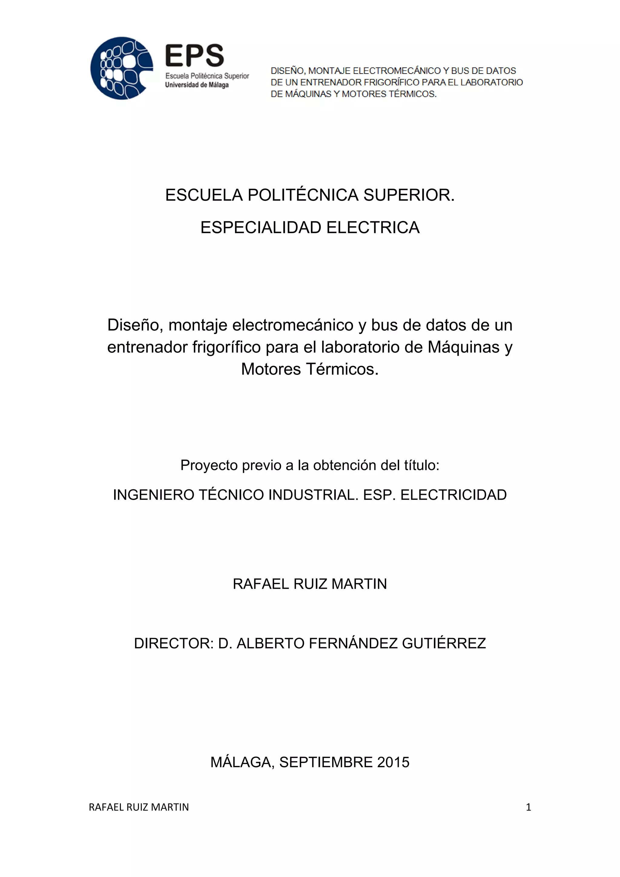 Este documento describe el diseño, montaje y configuración de un entrenador frigorífico para un laboratorio universitario. El proyecto incluye el diseño eléctrico y mecánico del entrenador, así como la instalación de un sistema de control y adquisición de datos mediante un bus Eliwell. El entrenador permitirá a los estudiantes realizar prácticas sobre instalaciones de refrigeración. El autor desarrollará manuales de funcionamiento y mantenimiento para facilitar el uso y reparación futura del equipo.
