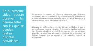 El documento presenta información sobre el uso de recursos multimedia y herramientas digitales en educación. Explica que estos recursos pueden elevar el nivel de interacción con los estudiantes y permitir que los maestros presenten contenidos de diferentes formas que se ajustan a estilos de aprendizaje. También proporciona ejemplos de elementos multimedia como videos, presentaciones, documentos de texto y publicaciones en redes sociales que se pueden incrustar en contenidos educativos.