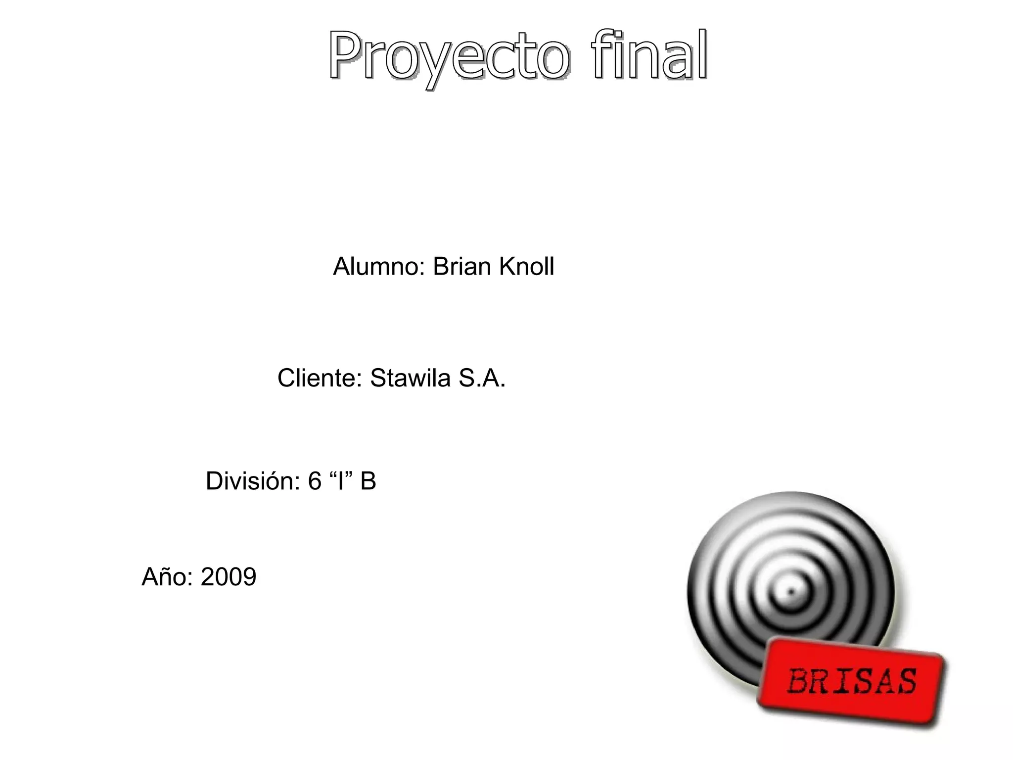 Este resumen describe un proyecto final para una fábrica de caños de acero llamada Stawila S.A. El proyecto propone crear un sistema de gestión para mejorar la productividad y organización de la fábrica, la cual actualmente carece de controles de stock e información organizada sobre proveedores, clientes y pedidos. El sistema propuesto controlaría los movimientos y organización de la fábrica a través de estudios previos sobre su funcionamiento.