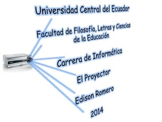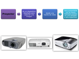 Este documento describe los principales tipos de proyectores, sus funciones y cómo proyectan imágenes. Un proyector captura una señal de video de un dispositivo externo y proyecta la imagen amplificada en una pantalla a través de una luz brillante y un lente. Existen proyectores LCD que usan cristales líquidos similares a los televisores LCD, y proyectores DLP que emplean microespejos para proyectar imágenes de alta calidad aunque son más caros de producir.