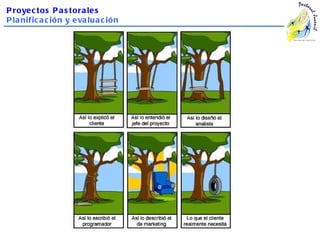 Este documento habla sobre la planificación y evaluación de proyectos pastorales. Explica que un proyecto pastoral son ideas y acciones orientadas al trabajo comunitario en este caso de tipo pastoral. Luego detalla los pasos para formular un proyecto como identificar el campo de aplicación, establecer objetivos, plan de trabajo, equipo, recursos necesarios y la ejecución del proyecto.