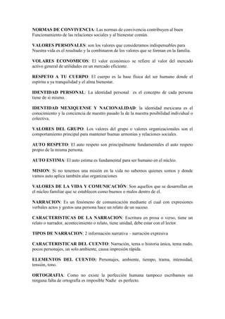 El documento presenta definiciones de varios conceptos y valores como la paz, la igualdad, la justicia, la felicidad, la responsabilidad, el amor, la tolerancia, la identidad y la equidad de género. También describe los tipos de valores como valores espirituales, materiales, personales, familiares y socioculturales e identidad personal. Por último, define valores morales y éticos.