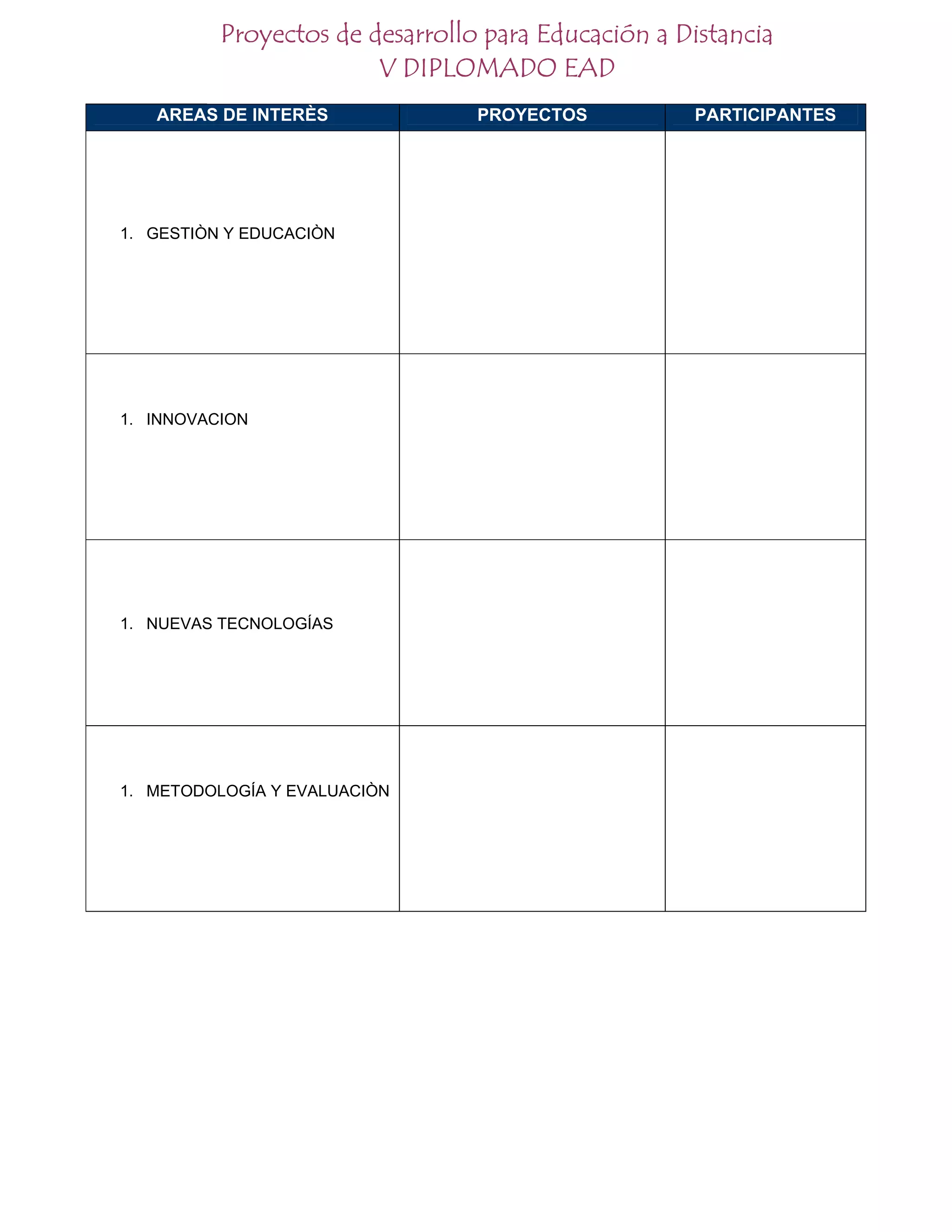 El documento lista 4 áreas de interés para proyectos de desarrollo en educación a distancia: 1) gestión y educación, 2) innovación, 3) nuevas tecnologías, y 4) metodología y evaluación.