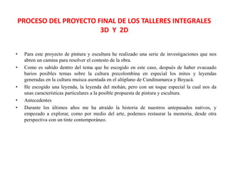Este documento describe un proyecto académico de un estudiante de Bellas Artes en la Universidad Industrial de Santander. El proyecto involucra una escultura y pintura inspiradas en la cultura Muisca, y se centra en una leyenda sobre un chamán llamado Mohán. El estudiante realizó investigaciones sobre los Muisca y propone crear una instalación que represente la importancia de las ofrendas y el intercambio para esta cultura a través de tunjos esculpidos y una puerta pictórica tridimensional con las im