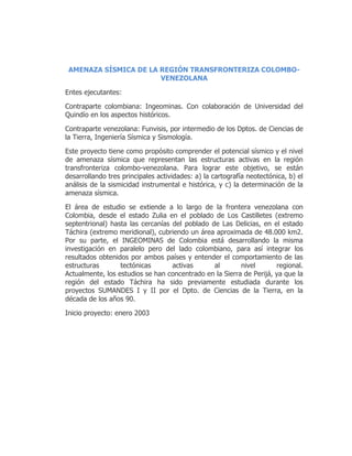 Este documento presenta varios proyectos de investigación relacionados con la amenaza sísmica en la región fronteriza entre Colombia y Venezuela. Los proyectos incluyen el mapeo de fallas activas, análisis de la sismicidad histórica e instrumental, determinación del riesgo sísmico y estudios sedimentológicos y sismotectónicos de lagos y el Golfo de Cariaco para identificar eventos sísmicos pasados. Otros proyectos se enfocan en el estudio de la corteza y el manto en el norte de Venezuela usando