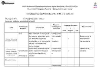 El documento presenta un formato de proyectos articulados al uso de TIC en la Institución Educativa El Cruce en el municipio de Tuta. Se describen 6 proyectos enfocados en áreas como ciencias naturales, ciencias sociales, educación ética y valores humanos, y tecnología e informática. Los proyectos utilizarán recursos tecnológicos como computadores, fotocopiadoras e Internet y estarán a cargo de los docentes de las diferentes áreas.