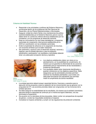 Este documento establece los criterios nacionales para la selección de proyectos de cooperación internacional en temas ambientales en Colombia. Describe criterios de viabilidad, metodológicos y técnicos que los proyectos deben cumplir como ajustarse a prioridades nacionales, garantizar contrapartidas locales, evitar duplicidad de esfuerzos, y asegurar la sostenibilidad de los resultados. También presenta los componentes clave que debe contener un proyecto como antecedentes, planteamiento del problema, objetivos, resultados, actividades e indicadores.