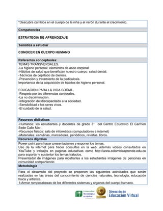 Este documento presenta un proyecto pedagógico sobre el cuerpo humano que se llevará a cabo en un colegio durante 15 días. El proyecto busca que los estudiantes reconozcan las partes internas de su cuerpo, sus funciones y la importancia de los hábitos de higiene a través de actividades prácticas y el uso de las TIC. Se detallan los objetivos, temas, recursos, metodología y cronograma del proyecto.