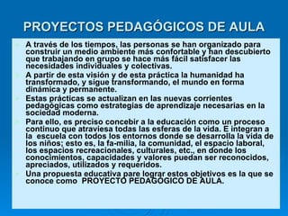 El documento describe los proyectos pedagógicos de aula como una estrategia educativa que integra la teoría con la práctica para lograr aprendizajes activos y significativos. Explica que los proyectos deben ser sistemáticos, contextualizados, didácticos y cooperativos, relacionando los contenidos con la realidad de los estudiantes y promoviendo la participación de todos. Además, clasifica los proyectos por su alcance, duración y objetivo, como proyectos individuales, de grupo, de grado o de la esc