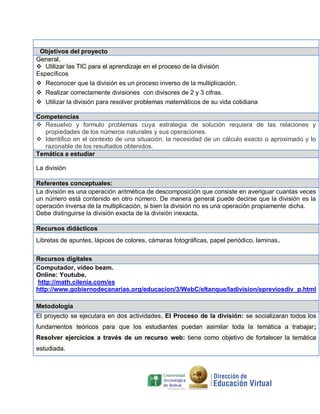 Este proyecto pedagógico utiliza las TIC para mejorar la comprensión de los estudiantes sobre el proceso de división. El proyecto involucra dos actividades principales: 1) explicar los fundamentos teóricos de la división a través de recursos en línea y ejercicios prácticos; y 2) fortalecer el aprendizaje resolviendo ejercicios adicionales usando un recurso web. El proyecto evalúa la participación, actitud y capacidad de los estudiantes para resolver problemas relacionados con la división.