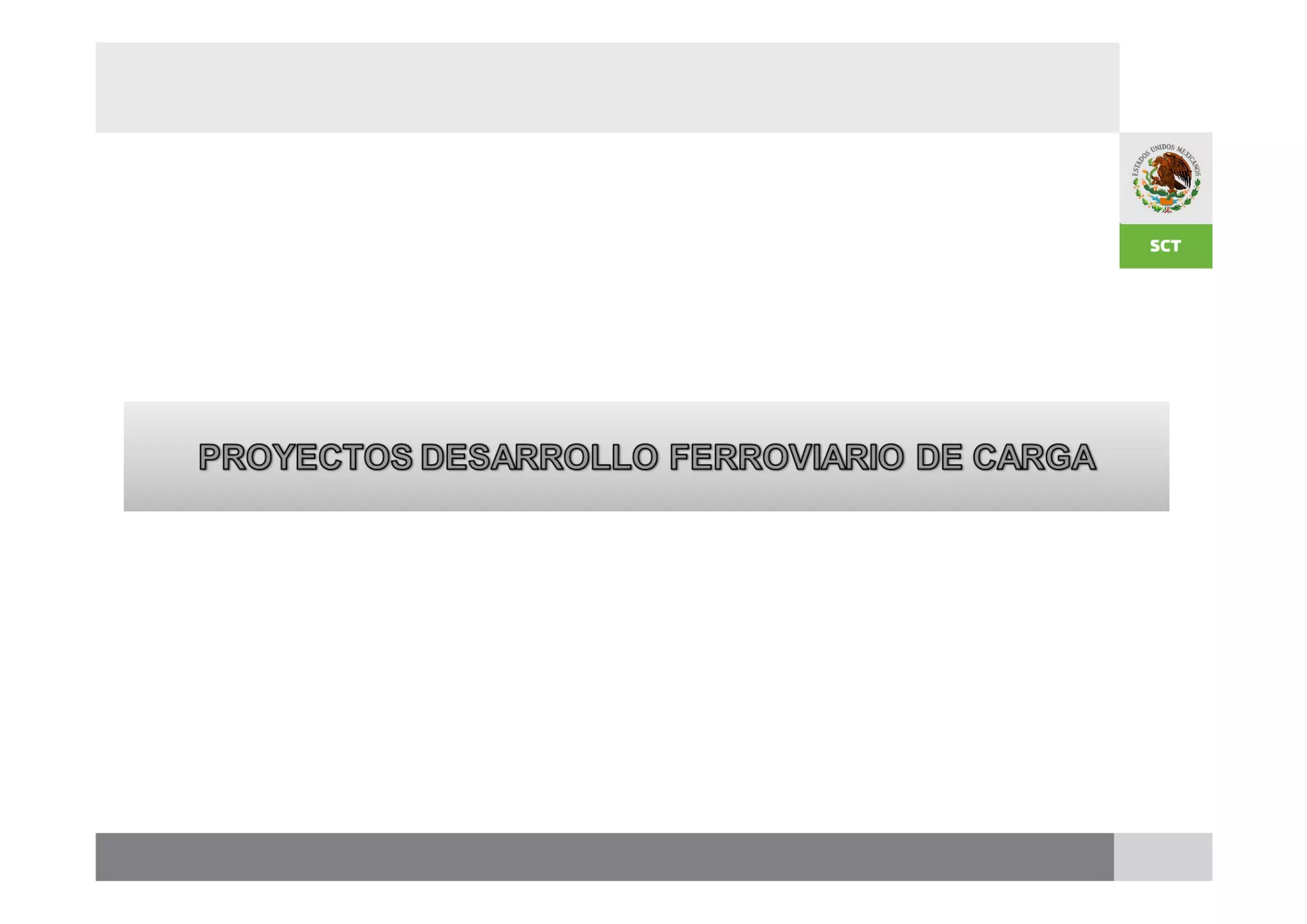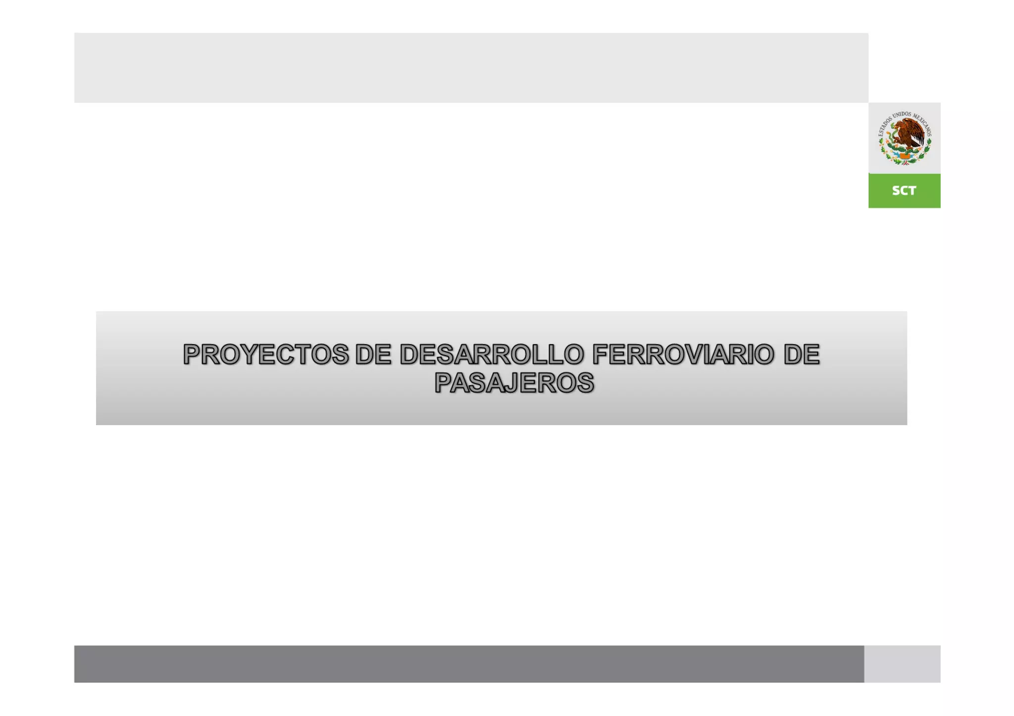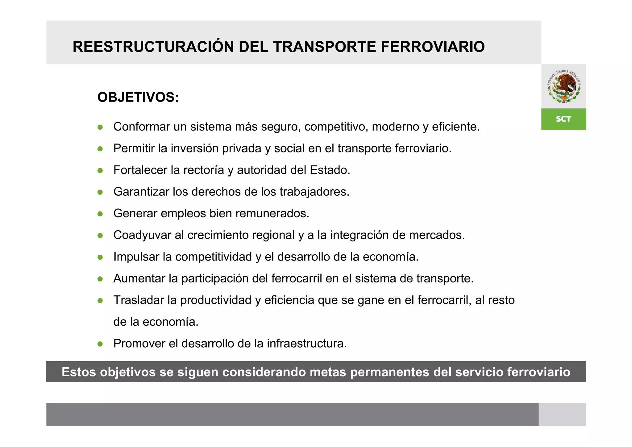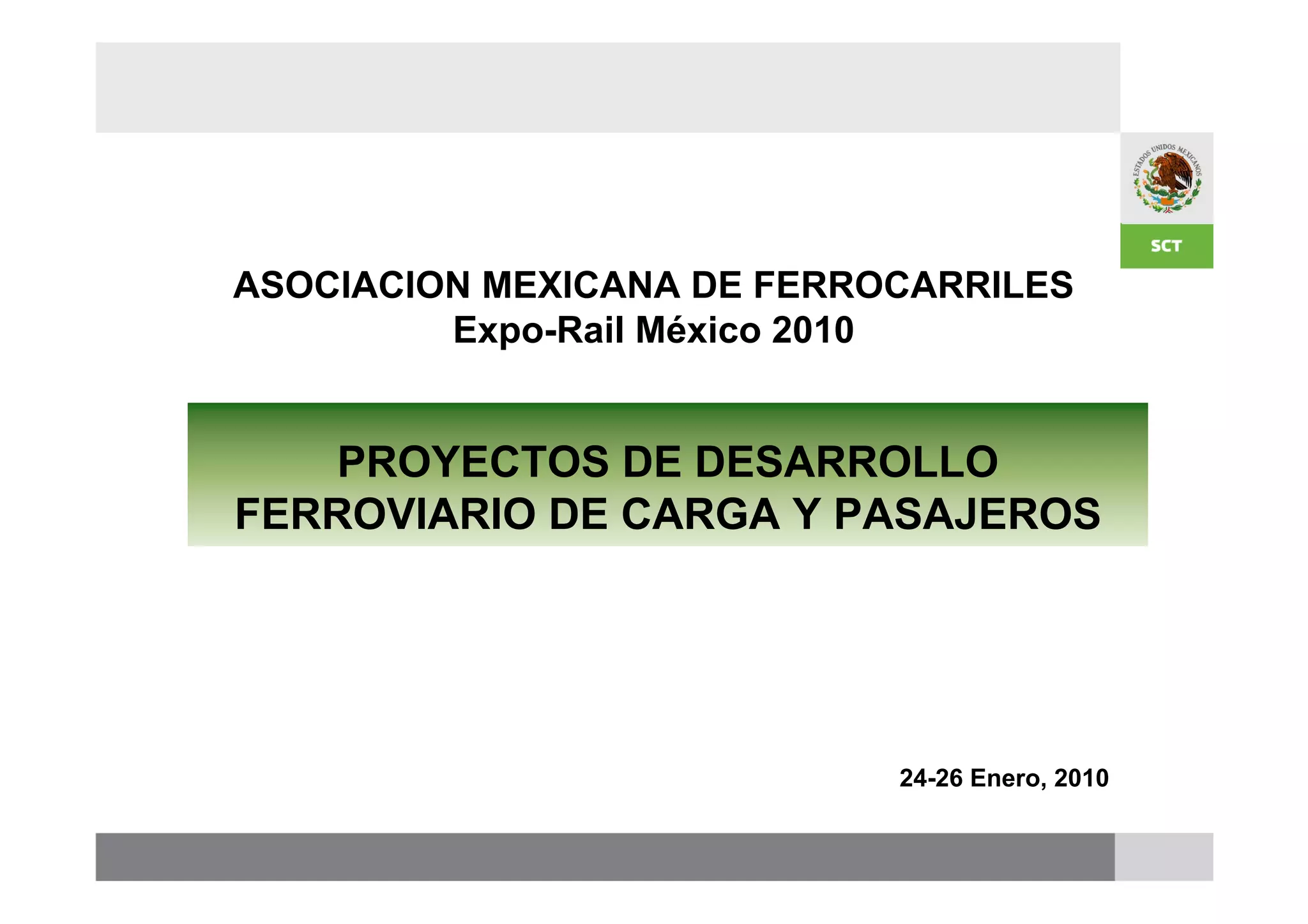 El documento presenta información sobre proyectos de desarrollo ferroviario en México. Detalla los objetivos de la reestructuración del transporte ferroviario mexicano y la situación actual del sistema ferroviario, incluyendo concesiones y asignaciones. También describe metas estratégicas como ampliar la infraestructura, mejorar la conectividad, y desarrollar trenes suburbanos. Un proyecto específico es la construcción de un tramo entre Aguascalientes y Guadalajara para acortar la ruta.