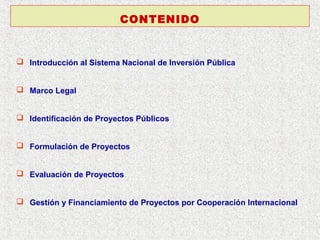 Este documento presenta información sobre el Sistema Nacional de Inversión Pública (SNIP) en Perú. Brevemente describe los componentes clave del SNIP, incluyendo su marco legal, identificación y formulación de proyectos públicos, evaluación y financiamiento de proyectos. Además, proporciona detalles sobre el ciclo de vida de un proyecto de inversión pública en el SNIP, que comprende las fases de preinversión, inversión, ejecución, postinversión y evaluación.