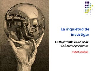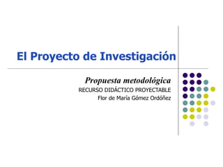 El documento presenta una guía para la elaboración de proyectos de investigación. Explica que un proyecto de investigación define el tema a investigar y los motivos para abordarlo. Describe las 8 secciones clave de un proyecto de investigación: 1) elección del tema, 2) planteamiento del problema, 3) objetivos, 4) justificación, 5) marco de referencia, 6) esquema de trabajo, 7) metodología y 8) cronograma. Finalmente, enfatiza la importancia de saber investigar y de contar con un plan de trabajo como