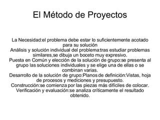 El documento describe diferentes métodos tecnológicos como el método de proyectos y el análisis de objetos. El método de proyectos implica definir un problema, analizar soluciones individuales y de grupo, y desarrollar y verificar la solución de grupo seleccionada. Los métodos de análisis evalúan objetos desde perspectivas formal, técnica, socioeconómica y funcional considerando su diseño, fabricación, uso social y económico, y mantenimiento. El documento provee ejemplos de planos de proyectos y